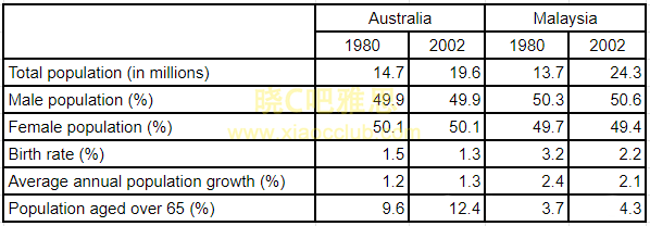 The table below gives information about population in Australia and Malaysia in 1980 and 2002.