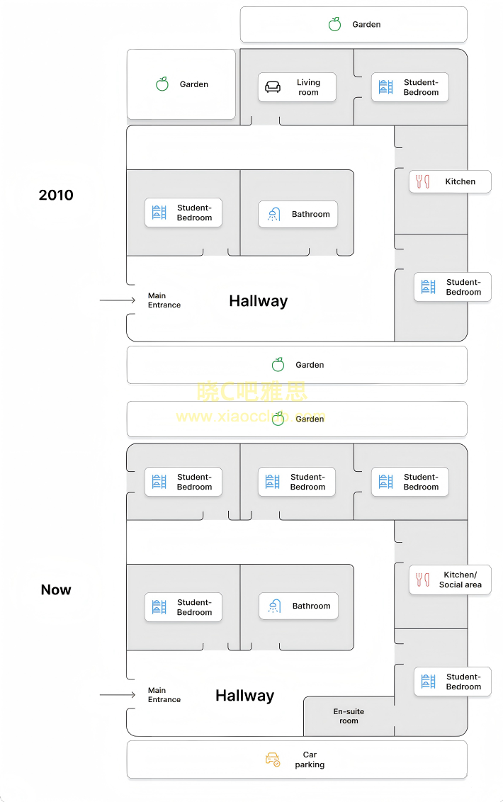 The diagrams give information about changes in a student accommodation.