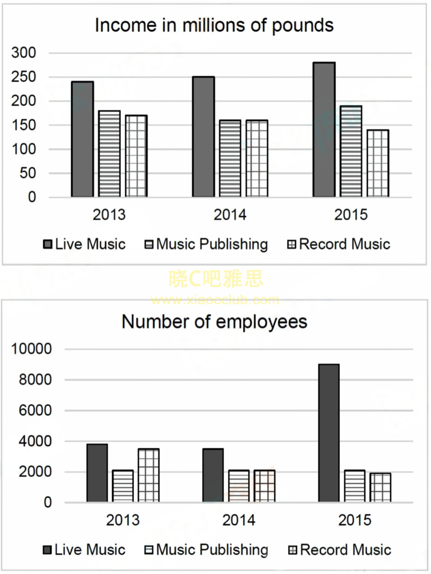 The charts below give information about the UK music industry by sector, in three years 2013, 2014 and 2015.