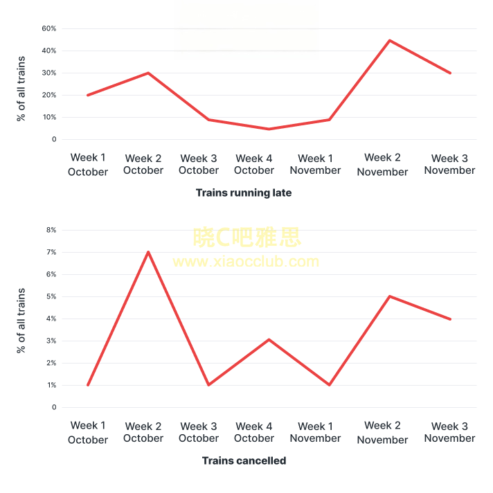 The graph below gives information on the performance of a train company in October and November in 2008.