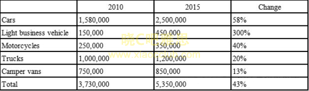 The table shows five types of registered motor vehicle in Australia in 2010 and 2015, with the change of percentage over these five years.