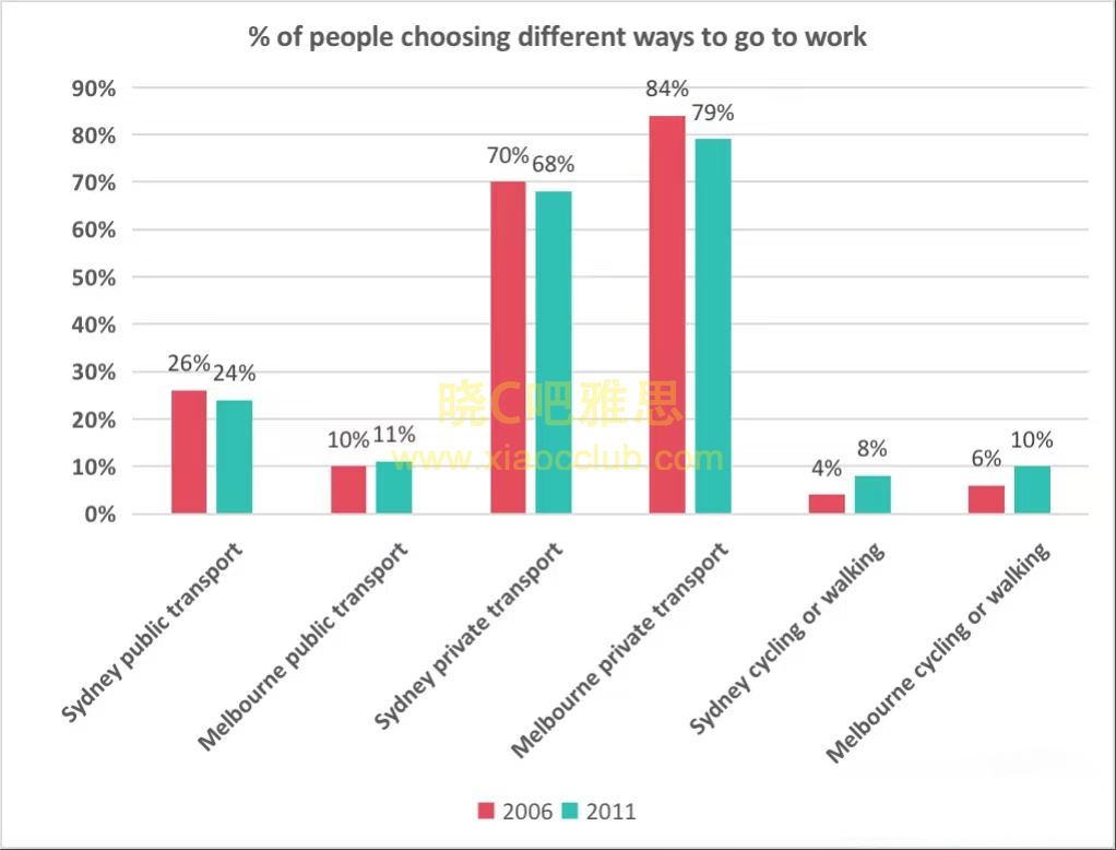 The chart below gives information about the percentage of people in Melbourne and Sydney who used different types of transport to get to work in 2006 and 2011.