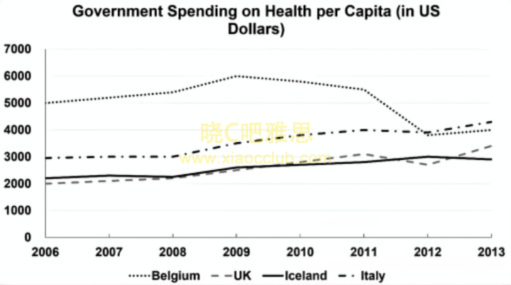 The graph below shows the average spending of four European governments on health per person(in Euros) from 2006 to 2013.