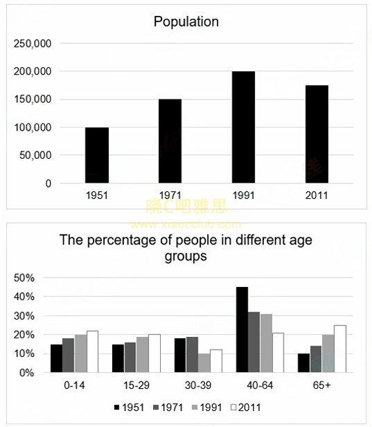 The bar charts below show the information about the population in a particular town in the UK from 1951 to 2011.