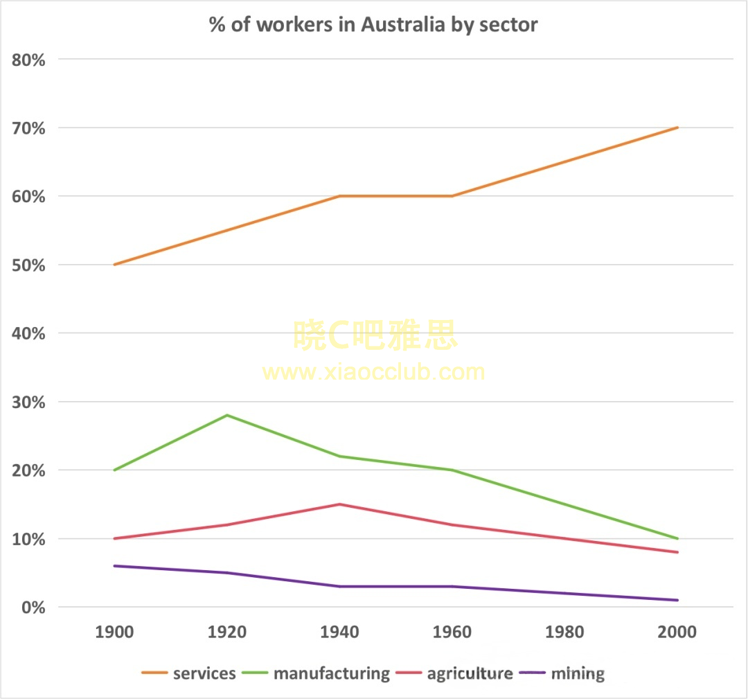 The graph below shows the proportion of worker employed by four different sectors in Australia from 1990 to 2000.